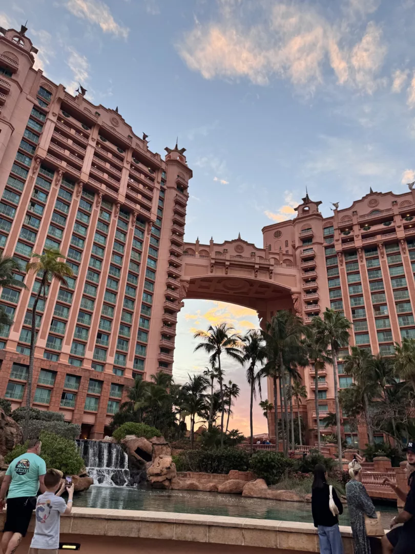 Na tym urzekającym zdjęciu uchwycono majestatyczny hotel, który o zachodzie słońca przybiera różowe odcienie. Architektoniczna perła Bahamów, z łukowym przejściem, które kadruje palmy i basen, tworzy idylliczną scenerię na wakacje na Bahamach. To miejsce, gdzie luksus spotyka się z tropikalnym klimatem, oferując niezapomniane wrażenia. Każdy, kto planuje wycieczkę na Bahamy, marzy o takich widokach. Bahamy to synonim rajskich wakacji, a ten hotel jest kwintesencją tego marzenia, łącząc w sobie elegancję i egzotykę.