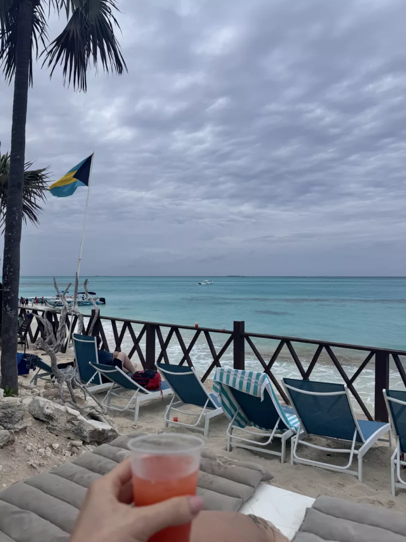 Mimo zachmurzonego nieba turkusowa woda i biały piasek plaży na Bahamach wabią do relaksu. Leżaki czekają na spragnionych słońca, a orzeźwiający koktajl w ręce podkreśla wakacyjny klimat. To idealna sceneria na wakacje na Bahamach, gdzie nawet pochmurny dzień ma swój urok. Flaga Bahamów powiewa na wietrze, dodając koloru scenerii. Wycieczka na Bahamy to synonim rajskich wakacji, a ten widok to esencja beztroskiego wypoczynku.