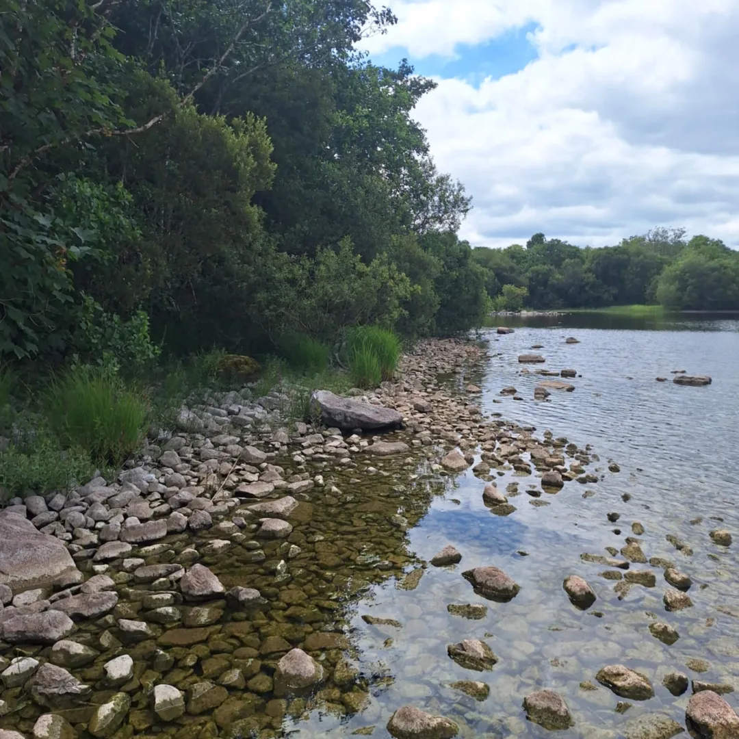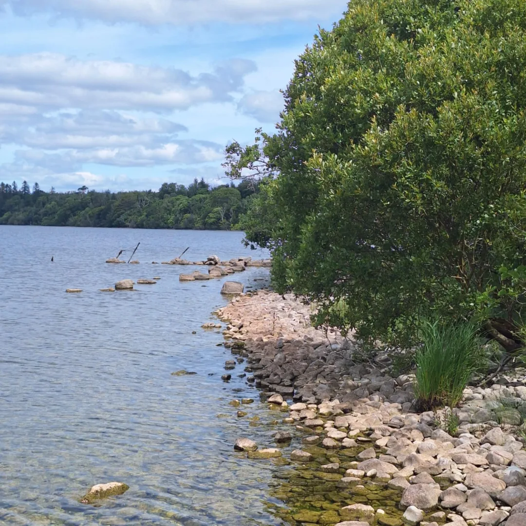 Kamieniste brzegi, porośnięte bujną, soczystą zielenią, tworzą naturalną ramę dla krystalicznie czystej wody, na dnie której widać każdy kamień. Zdjęcia ukazują dzikość i spokój tego miejsca – powalone drzewa i stare, drewniane pale wystające z wody dodają krajobrazowi surowego, autentycznego piękna. To sceneria, która zachęca do zatrzymania się na chwilę, wsłuchania w szum fal i śpiew ptaków, i poczucia prawdziwego ducha Szmaragdowej Wyspy.